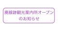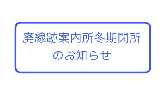 お知らせ 廃線跡案内所冬期閉所のお知らせ R7年12月15日(月)~R8年2月28日(土)の期間廃線跡案内所は冬期閉所となります。閉所期間中も駐車場はご利用いただけますが、お手洗いは閉鎖しますのでご了承ください。 2025.12.03 お知らせ